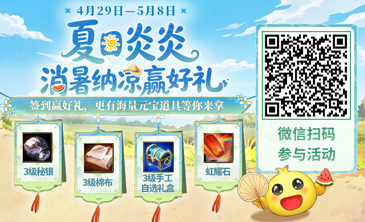 五一假期签到赢好礼,3级棉布、3级秘银、3级手工自选礼盒等海量好礼相送!更有机会获得天马坐骑。扫描下方二维码参与活动!